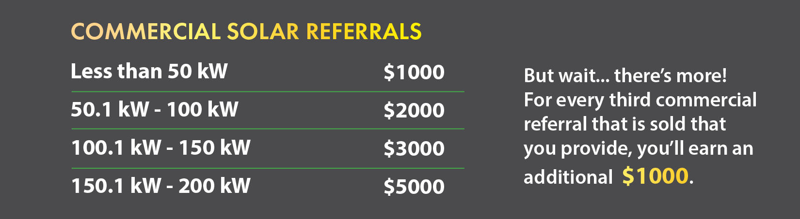 For Example:If three different referrals decided to purchase Solar, the affiliate would be given $500 for the first referral, $500 for the second referral, and $1000 for the third totaling $2000.